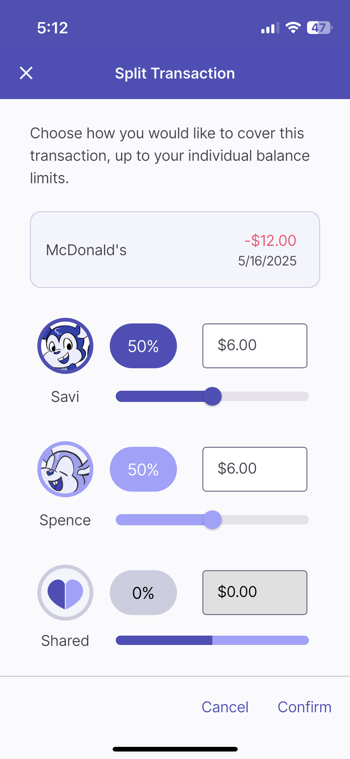 To split your transaction, simply enter the amounts each account owes for the transaction into their respective text fields. You can also use the sliders to set a percentage.