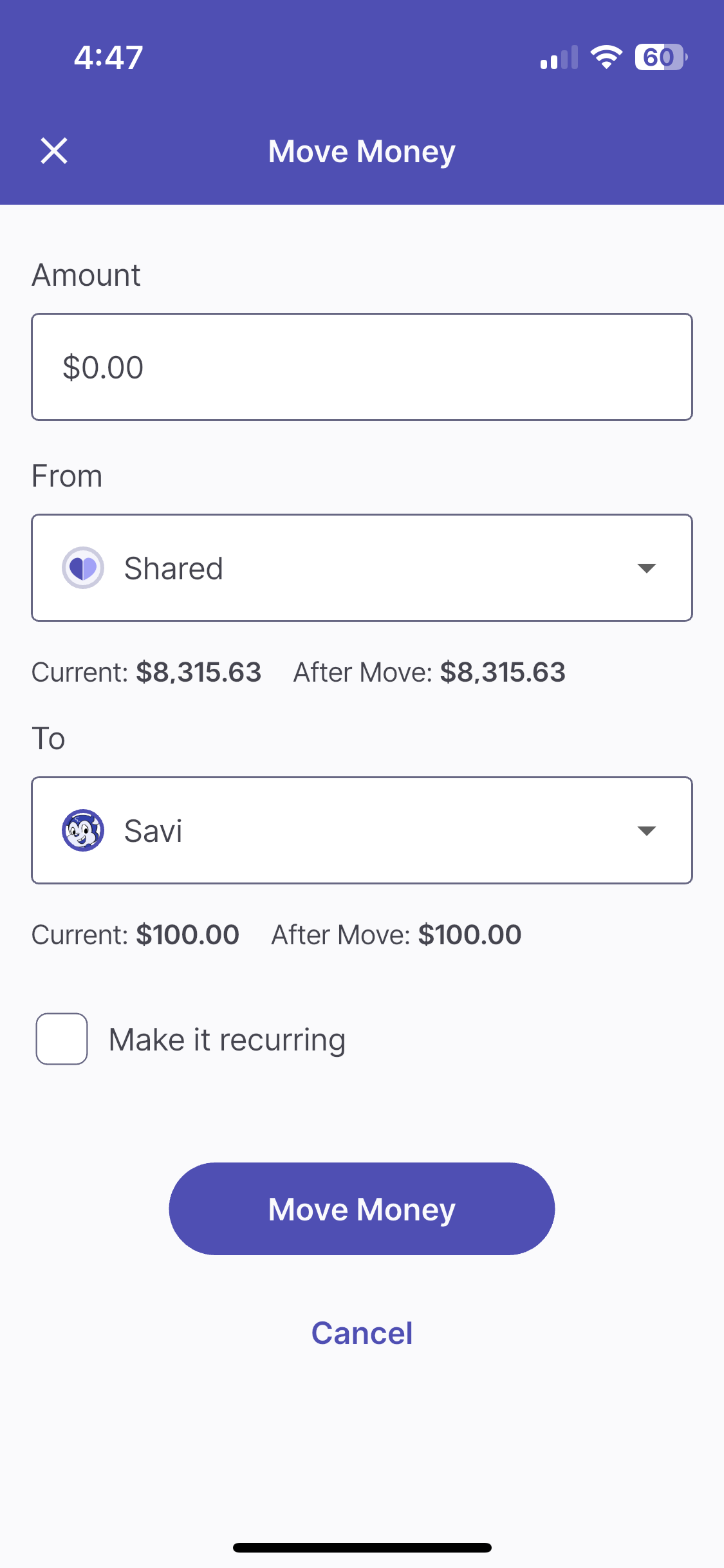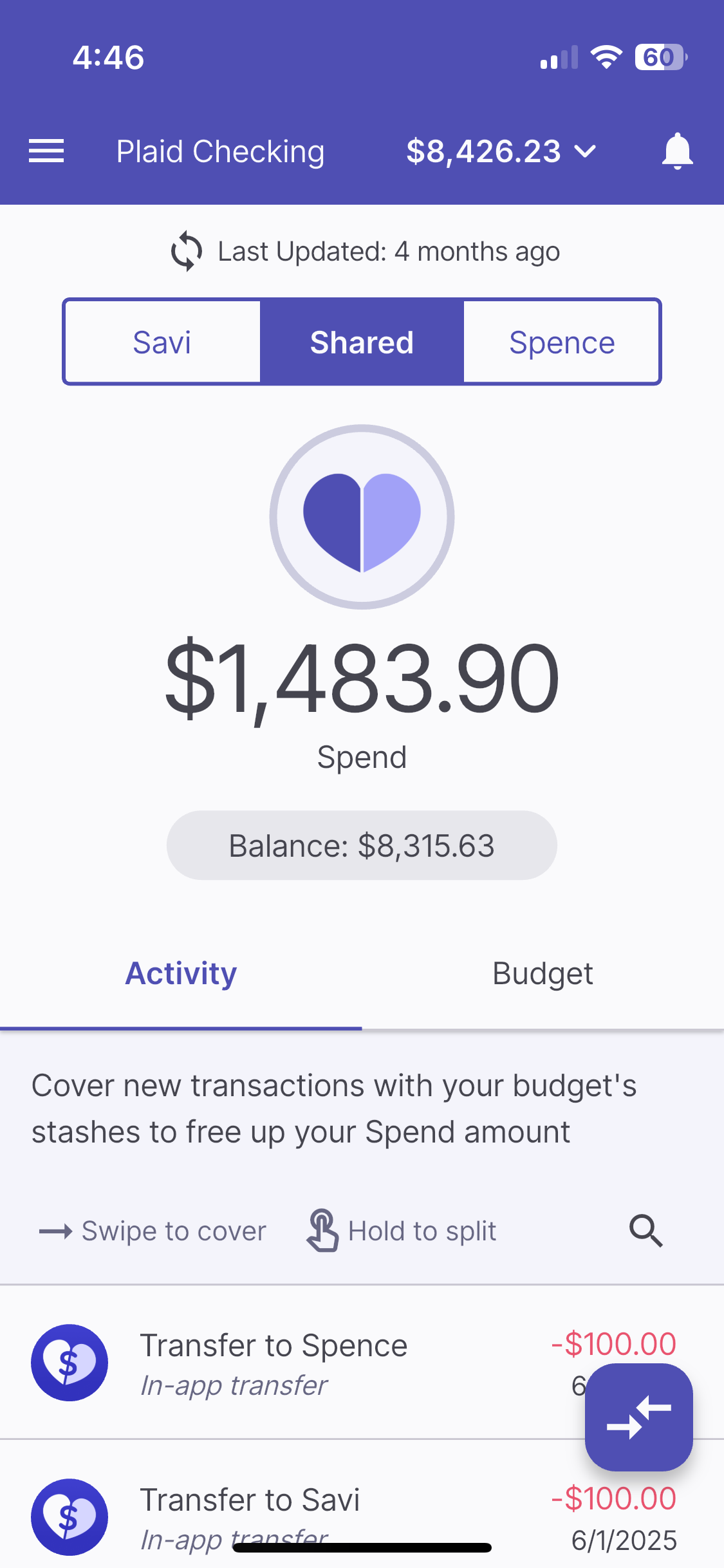 To transfer money between your personal and shared accounts within Halfsies, simply tap on the purple transfer button, floating at the bottom right of your Activity tab.
